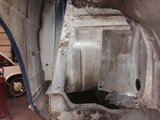 My 51 Hornet is missing splash guards behind the front tires. I have attached a photo of the firewall side of my front fenders (note the almost total lack of rust - want to keep it that way). There is some remnants of the rubber portion of the splash guard in the photo - maybe there was no metal panel and it was all rubber. Not sure if I am looking for a metal part plus the rubber pad or just a large rubber guard. I am looking for a photo of the parts that are missing or a lead on who may have them. It would help to have a photo so I can be sure I am ordering the correct body part. Thanks for your help. Gary