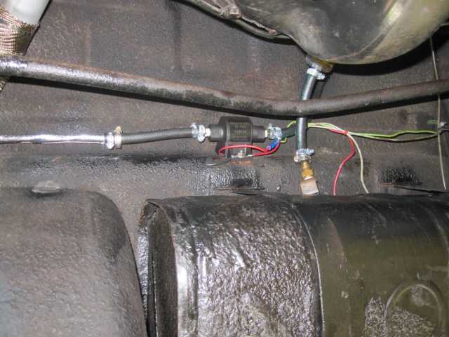 The HOLLEY elec. fuel pump(for back-up & prime). Note exhaust insulation next to gas line and Thermo-Tex 1/2" sleeve around the gas line at exhaust pipes.