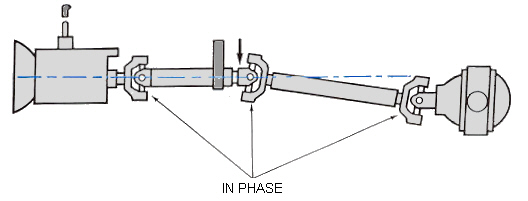 We noticed that the two piece drive shaft is not aligned so that the yokes are all in the same position.