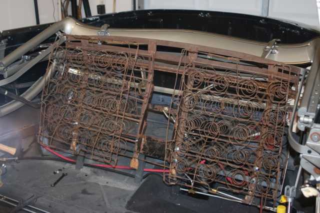 Just make one! Actually, this has been in the works for some time now, but just about finished up the springs for the seat back today. Thanks go out to Michael Whitely and Rob Fayette, and Bill Spelic for the great pics and dimensions. Just a little more to go on the back and then I will be taking this to the trimmer's this week. Tomorrow I'll get the seat bottom laid out. For the seat back, I had about 1/2 of a seat back from a junior convertible (Junior cars do not have the center arm rest). The bottom half was rotted away, like someone set it acid 1/2 way up the seat back. It was only about a foot tall when I started. I had some extra sedan springs that loaned parts and pieces for the seat back and seat bottom.