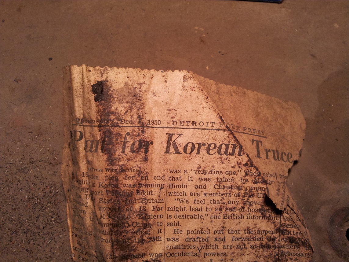 Underneath the backseat carpet and wedged between the side vinyl trim and the tar paper underlayment, there was a corner of a newspaper. Here was a ripped corner of the Detroit Free Press from Wednesday, December 6, 1950 wedged into the car.