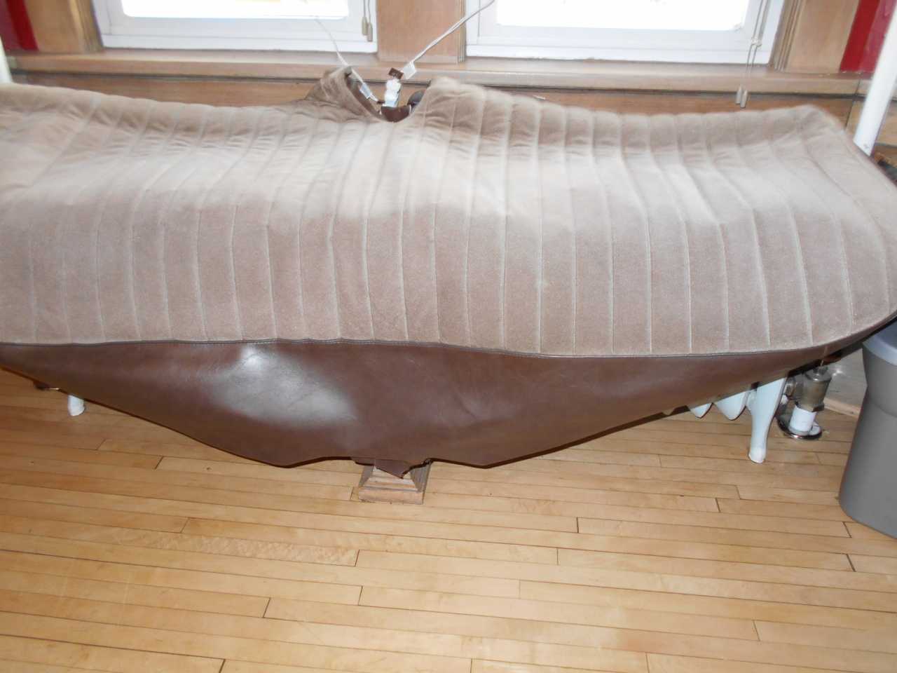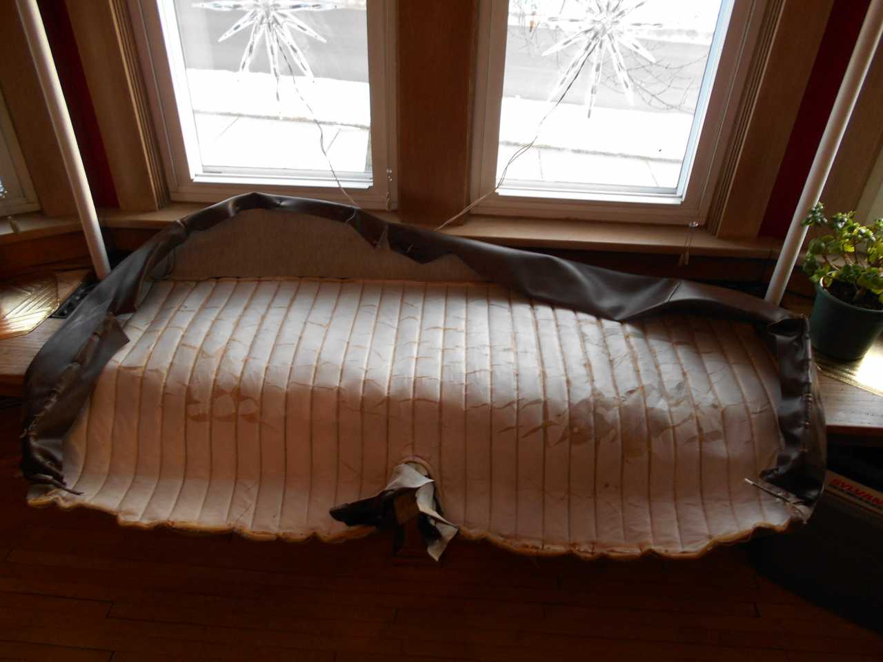 Scott- here's a couple pictures of one of the covers I removed. I'm still pondering what to do but realized I don't need to have an upholsterer take anything apart IF the seats from a '50 convertible and '51 coup (Hollywood) are the same. The seats covers from our convertible were taken off by the previous owner and put in bags so those are what I would have the upholsterer use for a pattern IF the seats are the same. The pleats in the seat are two inches apart and there's some kind of material sewn on the bottom under the pleats.The overall color is brown. Merry Christmas to all. Terry & Elaine
