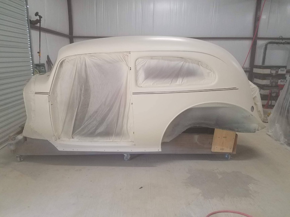 My 37 terraplane getting painted color is actually a little darker tan. Pushing toward the original mandalay. Root beer color stripes.