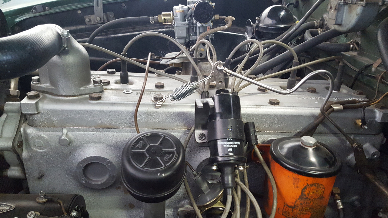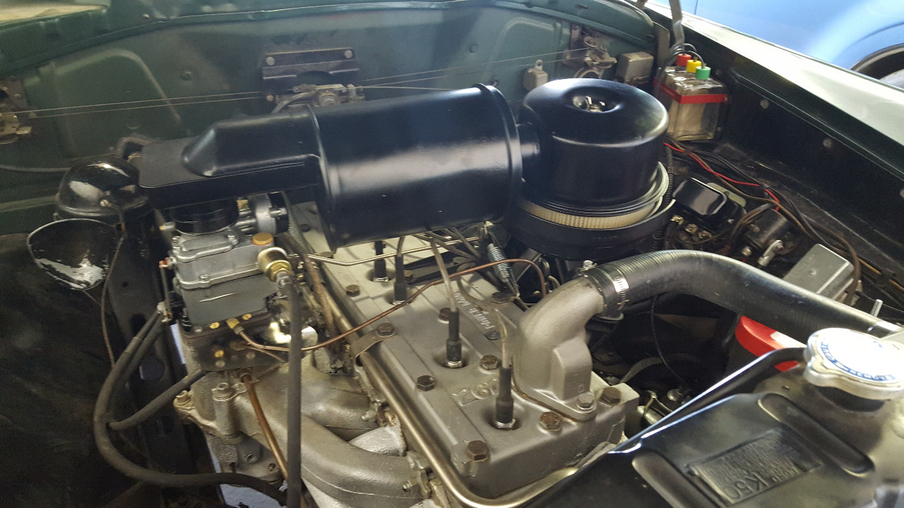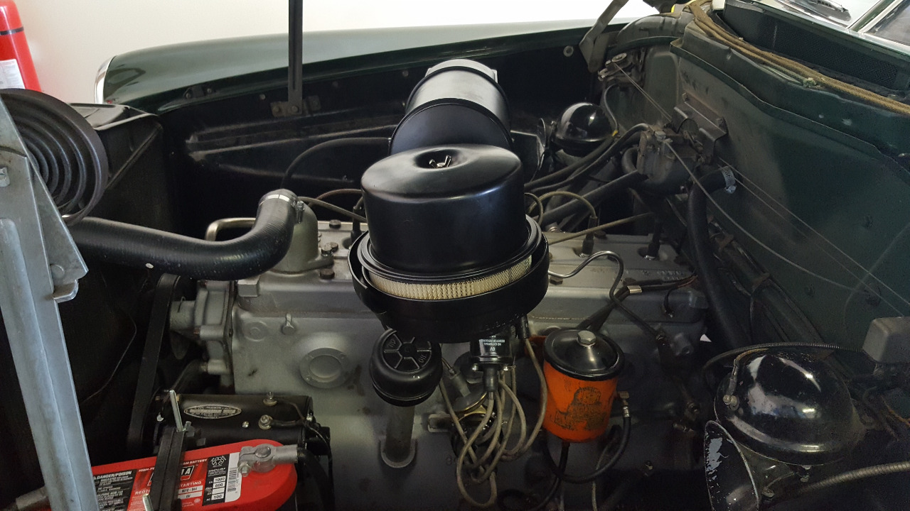 This is an interesting request?. The more I have thought about this, I have seen the long oil bath air cleaners on 8 cyl. engines but not that style on a 6 cyl. engine, only the round donut style?. The 8 cyl. oil bath support bracket uses special double ended studs in the water jacket to secure it. It also mounts at an angle. I have seen the dry type for a 6 cyl. '48 -'50 that mounts across the engine and has a small bracket that mounts on the linkage bolted on the cyl. head. I have made a special bracket to use one this style on a later big 6, made it look like it belonged.