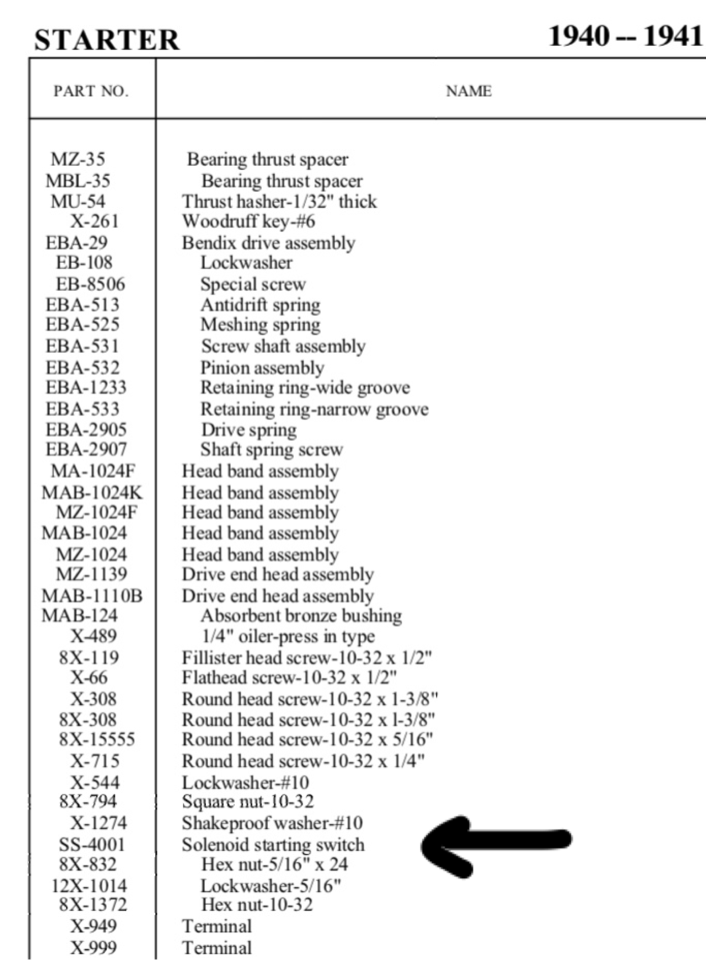 Hudson lists the 1940-only solenoid as part number X-159935 but (unhelpfully) does not list the AutoLite part number of the solenoid. Normally the parts book (for the specific year of Hudson) gives Autolite's generator, starter, distributor, etc. part number for that item, making it easy to find an Autolite replacement. The detailed drawing of the starter (referencing individual part numbers) in the manual, does not even picture the solenoid. Leaving one to wonder if the starter solenoid was even attached to the top of the starter (as is the case in all other 1934-49 Hudsons). I wonder why they changed this for 1940 only? Maybe a fellow 1940 owner can answer this question.