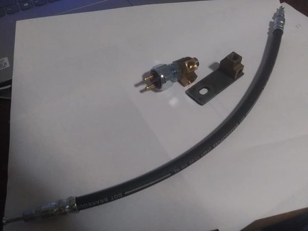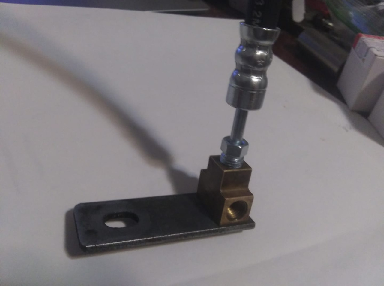 Had a new master cylinder to frame Tee hose made locally using BrakeQuip parts today. Cost is up about 30-35% from the 2014 cost that John Forkner paid. I also found a source for a new three way brass Tee with all three ports 3/8-24 female inverted flare, fastened to a metal plate that goes on top of the left front inner fender diagonal strut's rubberized fabric noise isolation pad, using a 5/16" body bolt.