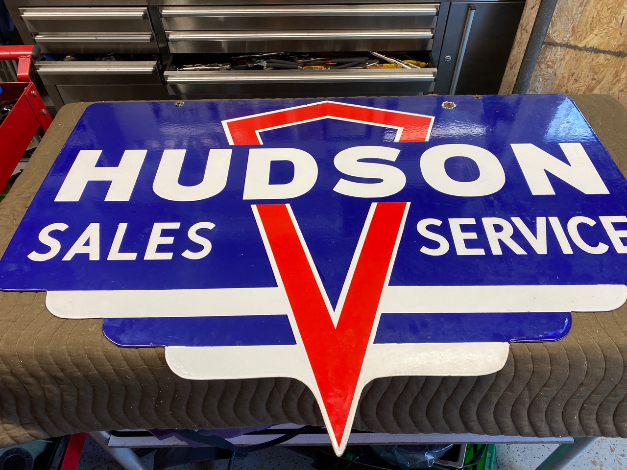 I very recently acquired this double sided porcelain Hudson sign to hang in my garage. It is double sided and measures 42 inches wide by 24 inches high.