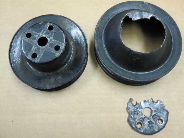 Attached is what happened to my '54 rare power steering water pump 2-groove pulley. First day I drove the car!! Anyway, no other damage except wallet for a roll back charge for 100+ miles.